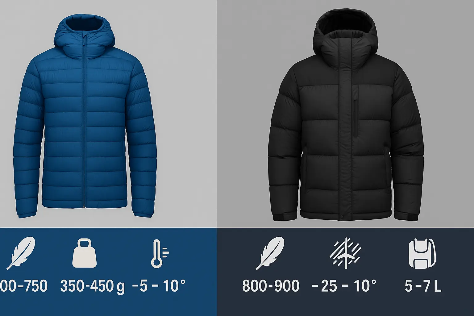 Fill Power (مثلاً 700، 800 یا 900) نشان میدهد هر واحد وزن از پر، چقدر پف تولید میکند. هرچه این عدد بالاتر باشد، برای رسیدن به گرمای مشابه، پرِ کمتری لازم است و وزن کلی پایینتر میآید.